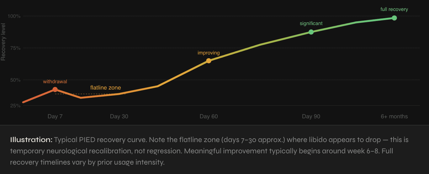 Recovery from PIED is real and well-documented — but it is not fast, and it is not linear. Here's a realistic breakdown of what most men experience when they stop using porn.