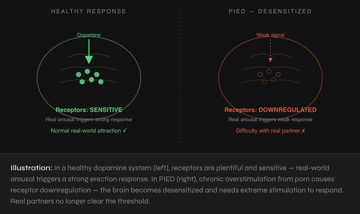 The consequence: your dopamine system now requires more stimulation to produce the same response. Normal stimuli — including a real, attractive partner — no longer clear the activation threshold needed to trigger and maintain an erection.